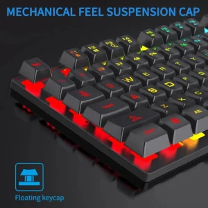 Description:★3 Kinds of Colorful Lighting :The keyboard features 3 different colors of lighting, allowing you to customize your typing experience and add some personality to your setup.★Mechanical Operation Style :The mechanical operation style of this keyboard ensures a responsive and accurate typing experience, making it perfect for both gaming and office use.★USB Interface Type :With a USB interface type, this keyboard is easy to connect to your computer or tablet, ensuring a seamless typing experience.★104 Keys Standard :This keyboard features 104 keys, providing a full range of functionality for all your typing needs.Specification:●Bare machine size: 42.8 * 15.2 * 2.8cm.●Color box size: 46 * 17 * 3.7cm.●Lamp efficiency: three-color lamp●Key position: 104 key●Interface: USB wired●Line length: 1.5M●Waterproof and dustproof●Floating cap key●Mechanical Feel